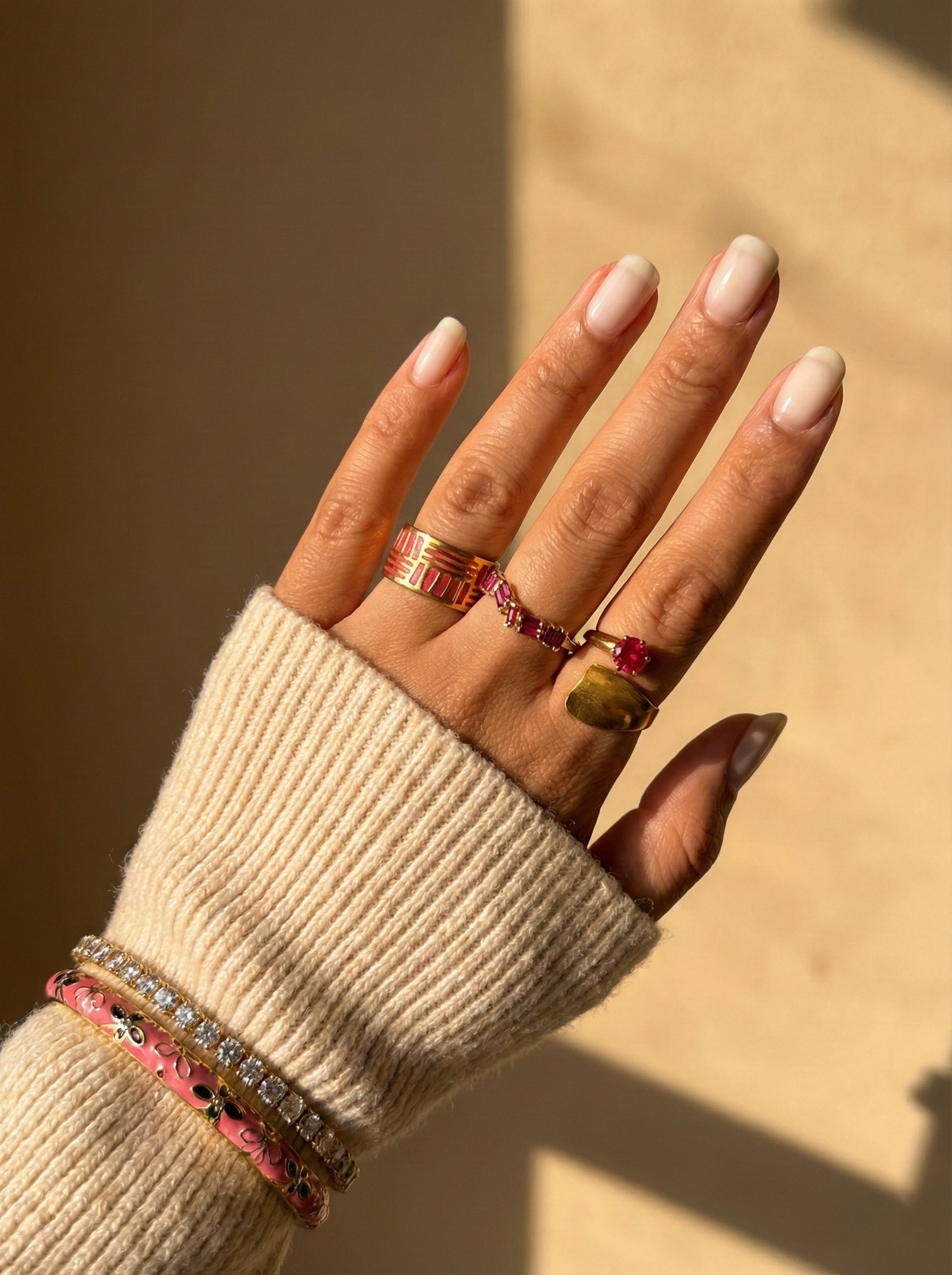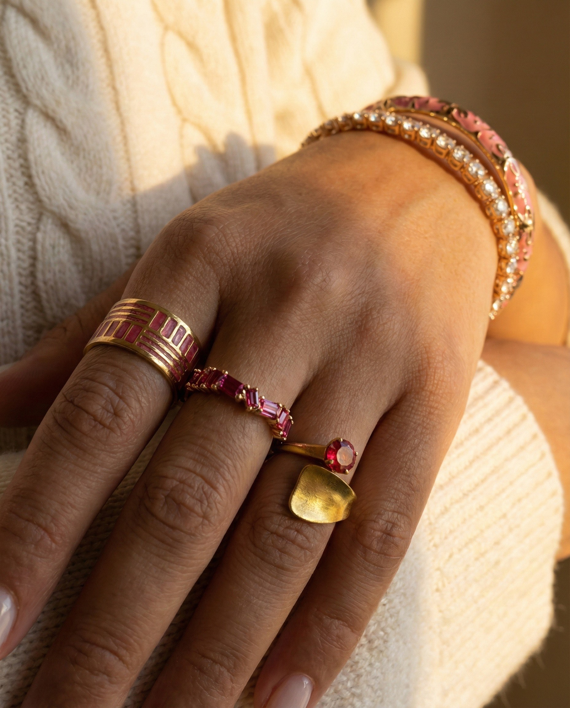 The Rings selection features expressive designs that balance bold form with refined detail. Sculptural gold finishes, pink stones, and enamel accents come together to create standout pieces that elevate the hand with confidence and personality.