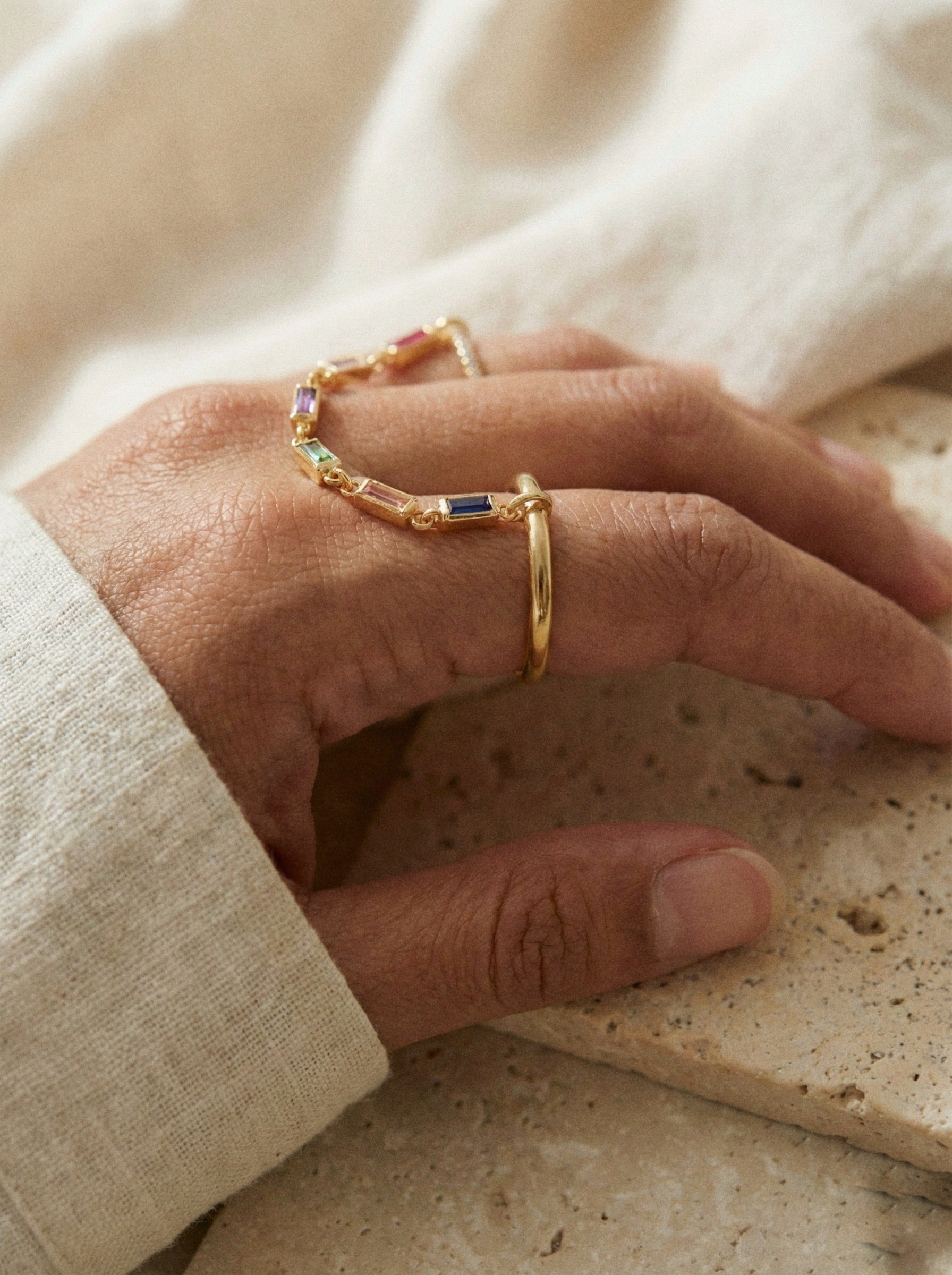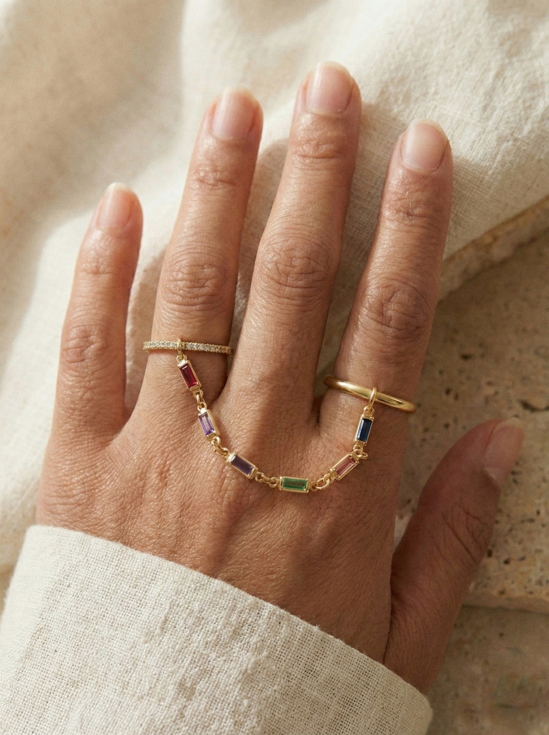 The Chromatic Links Chain Ring is a refined statement piece that blends fluid movement with vibrant color. Designed as a delicate double-ring style connected by a fine gold-tone chain, it features a sequence of baguette-cut colorful stones that create a soft chromatic flow across the hand.