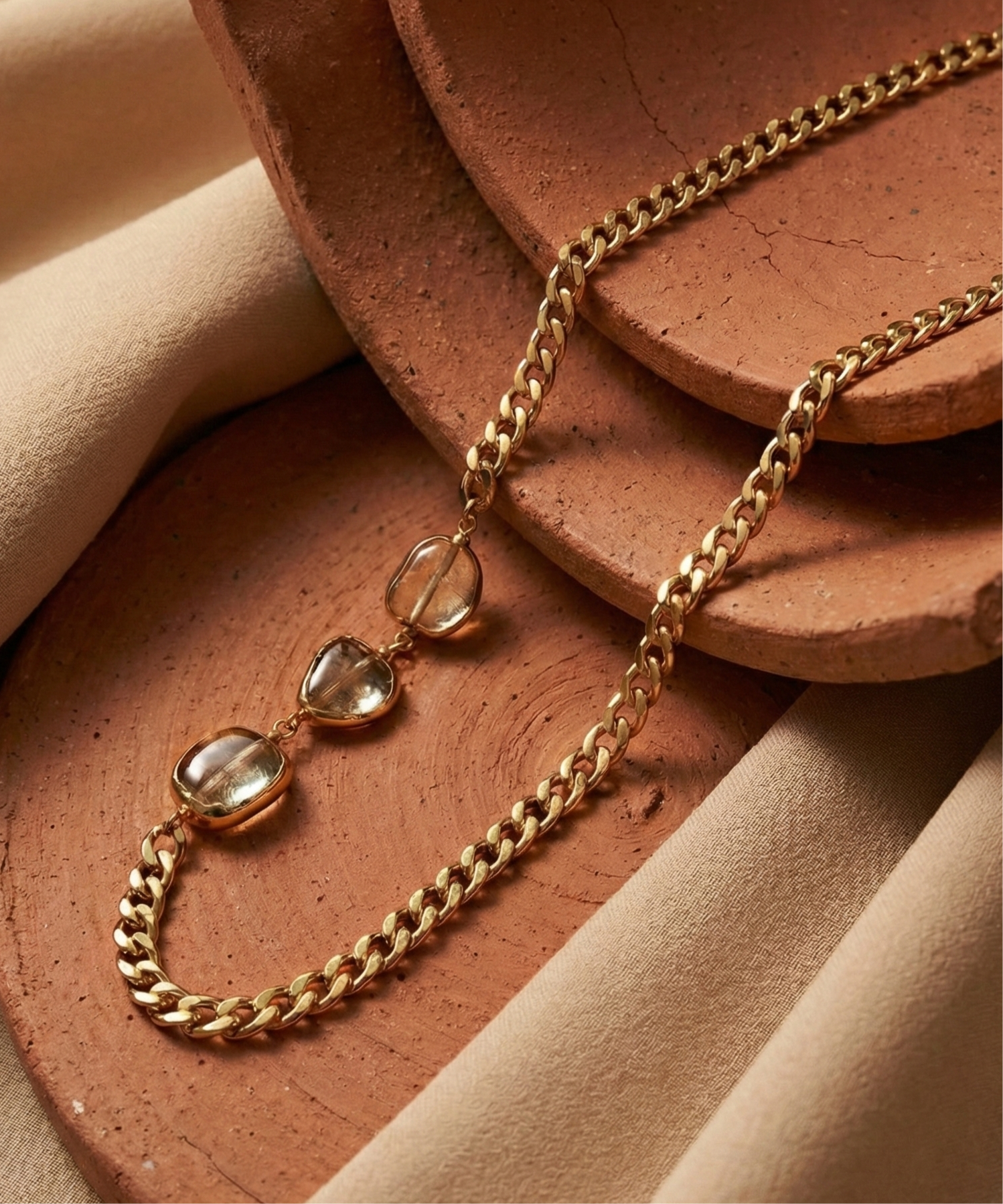 The Honey Citrine Necklace is a warm, luminous piece designed to bring a soft golden glow to everyday looks. Featuring natural citrine stones in rich honey tones, this necklace reflects light beautifully while adding a refined pop of color that feels both elegant and effortless.