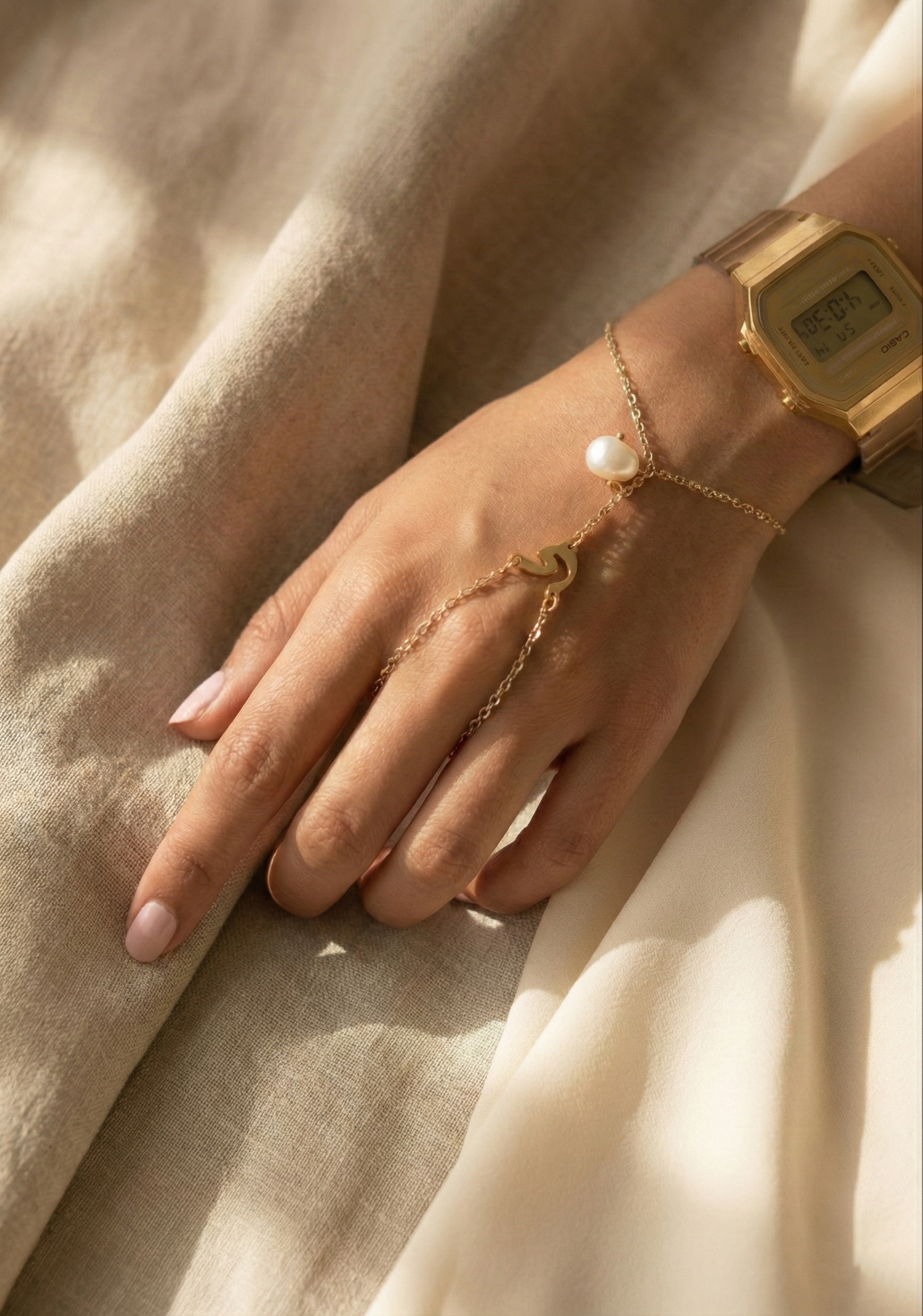 The Pearl Initial Whisp is a delicate, customizable hand chain designed to carry a personal touch. Featuring a fine gold-toned chain, a custom initial charm of your choice, and a soft natural pearl, this piece drapes effortlessly across the hand like a gentle whisper.