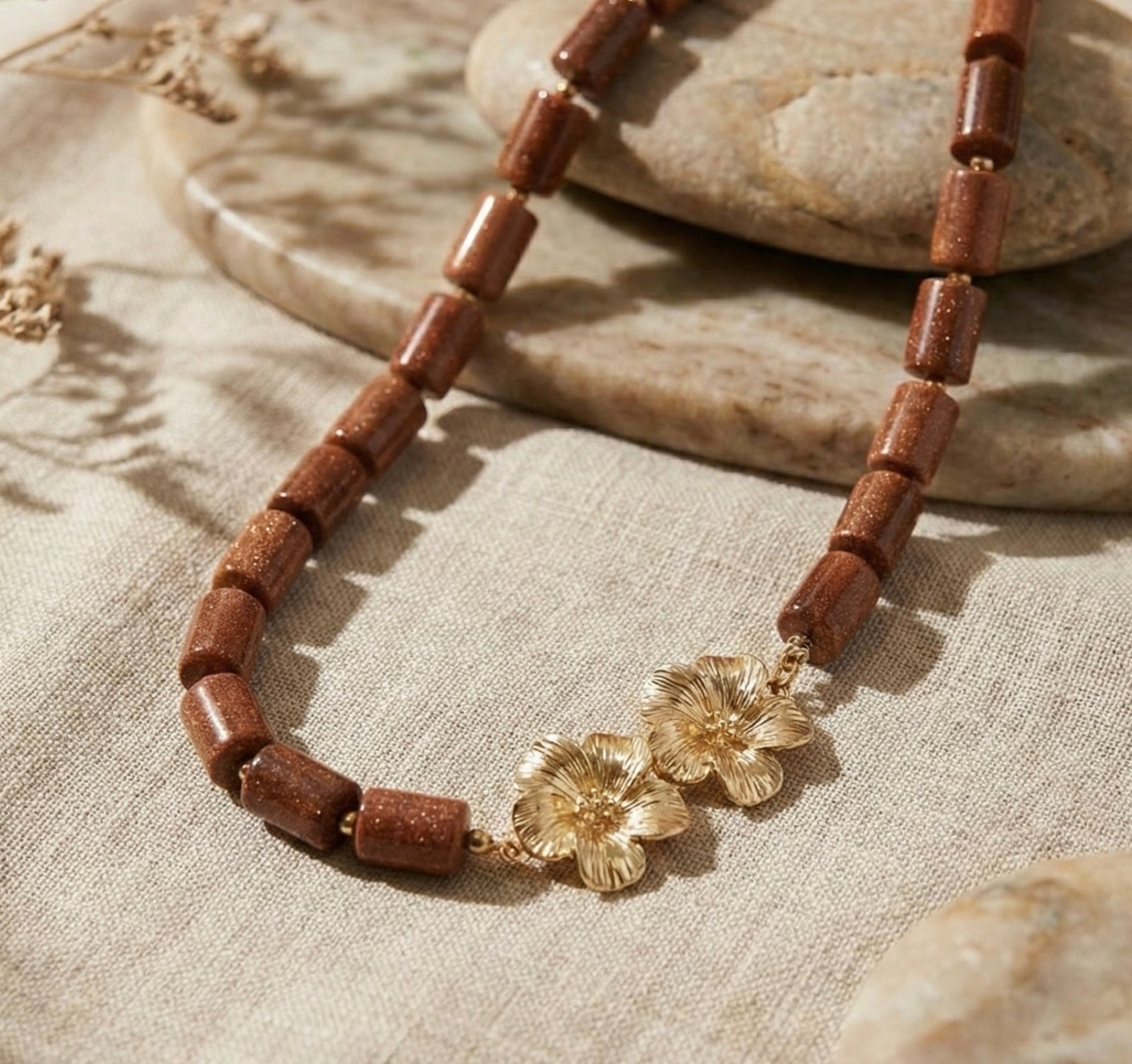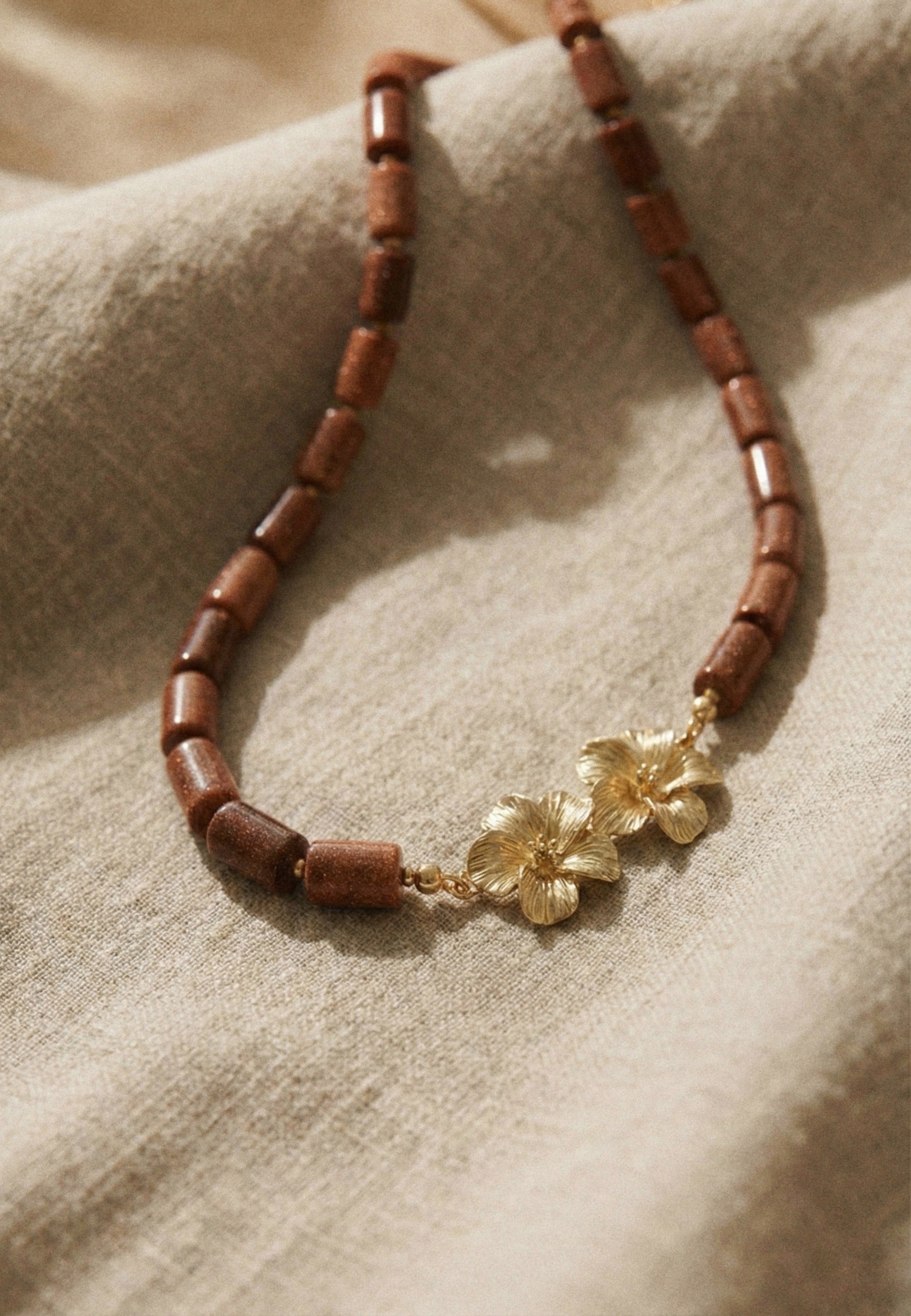 The Desert Bloom Necklace is a warm, earthy statement inspired by sun-touched landscapes and natural textures. Crafted with cylindrical brown stone beads, this piece is accented with delicate gold floral elements that add a soft, luminous contrast to the grounded tones.