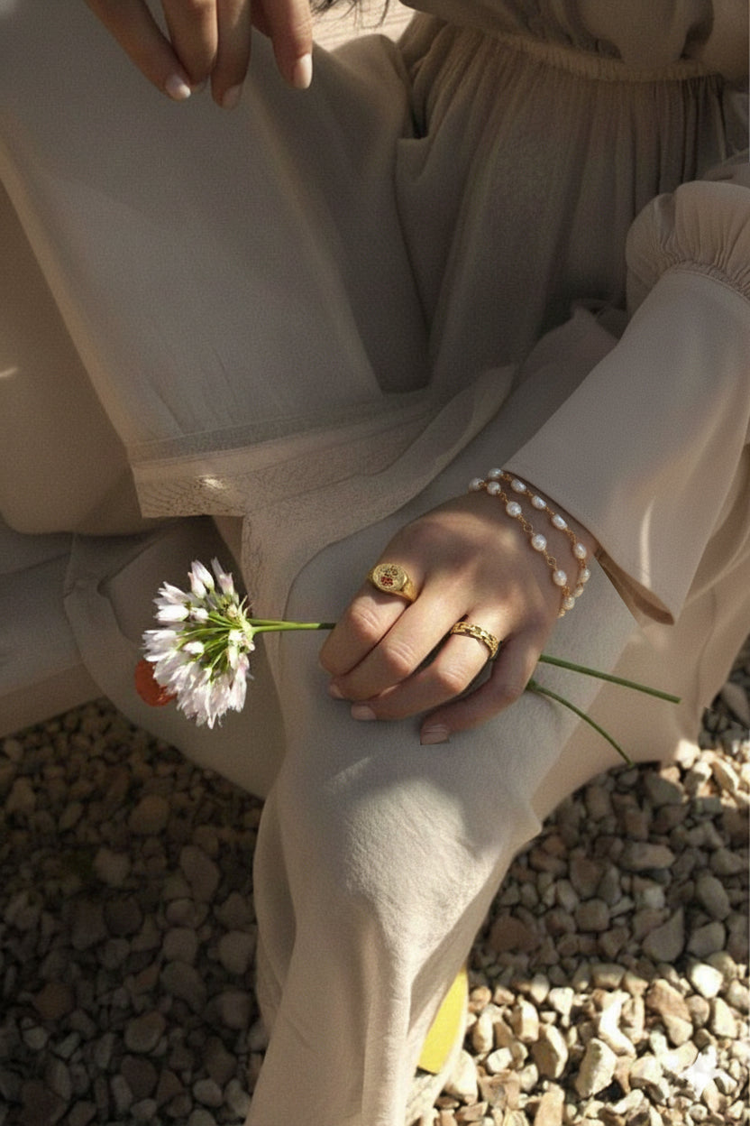Graceful, golden, and full of quiet charm — the Eden Set brings together three timeless pieces that balance nature and refinement. Featuring the Natural Pearls Chain Bracelet, The Red Petal Enamel Ring, and The Golden Squared Links Ring, this trio embodies effortless sophistication.