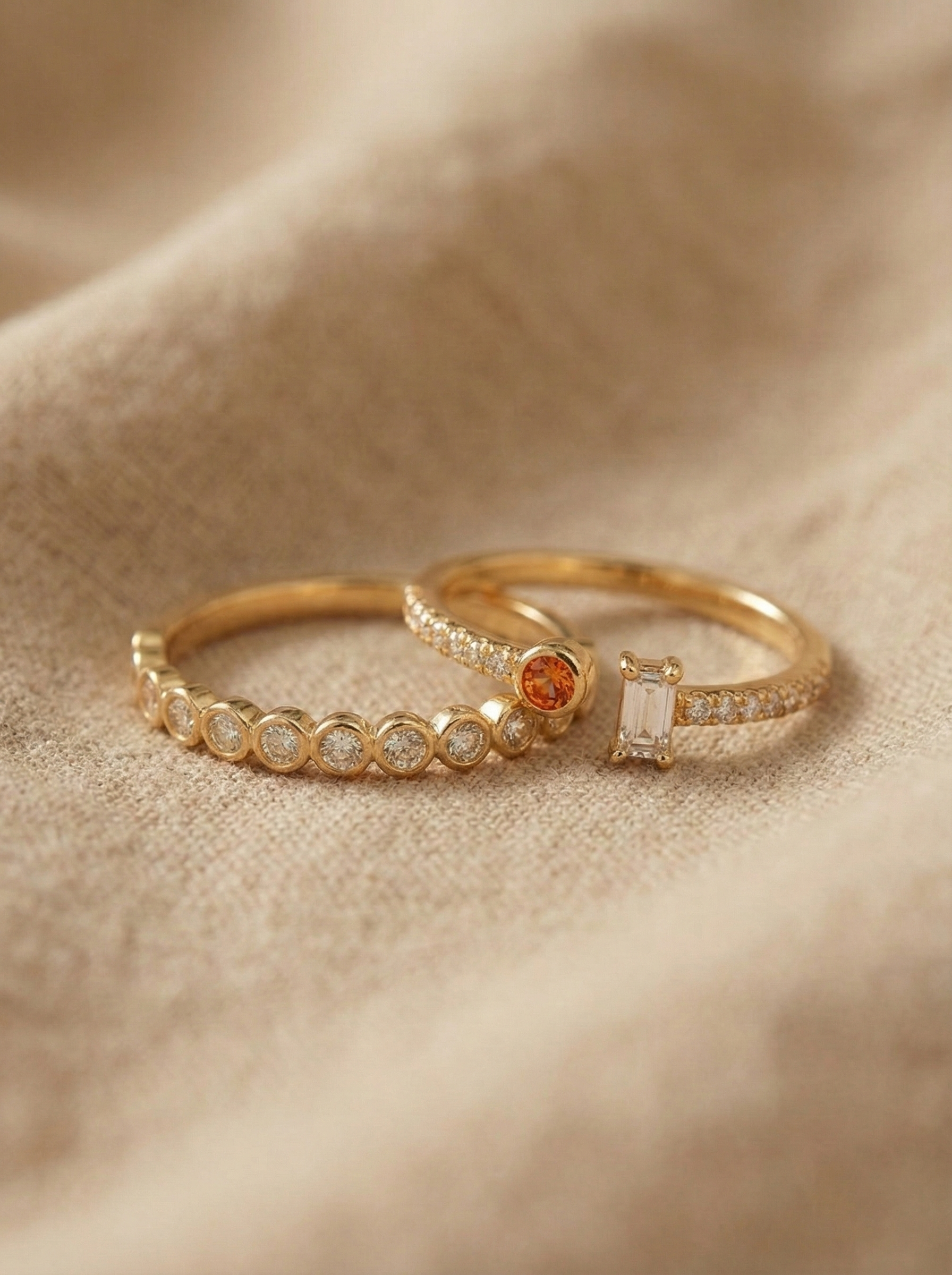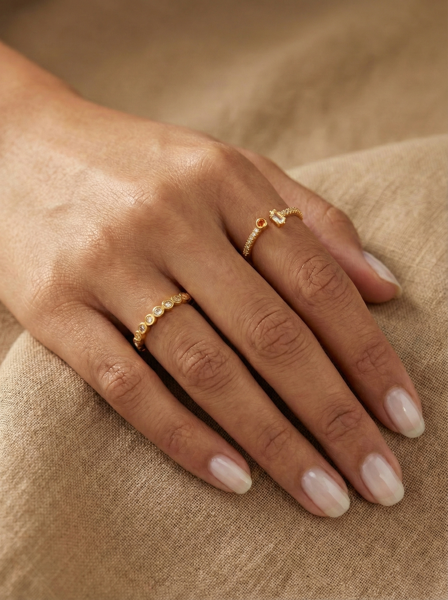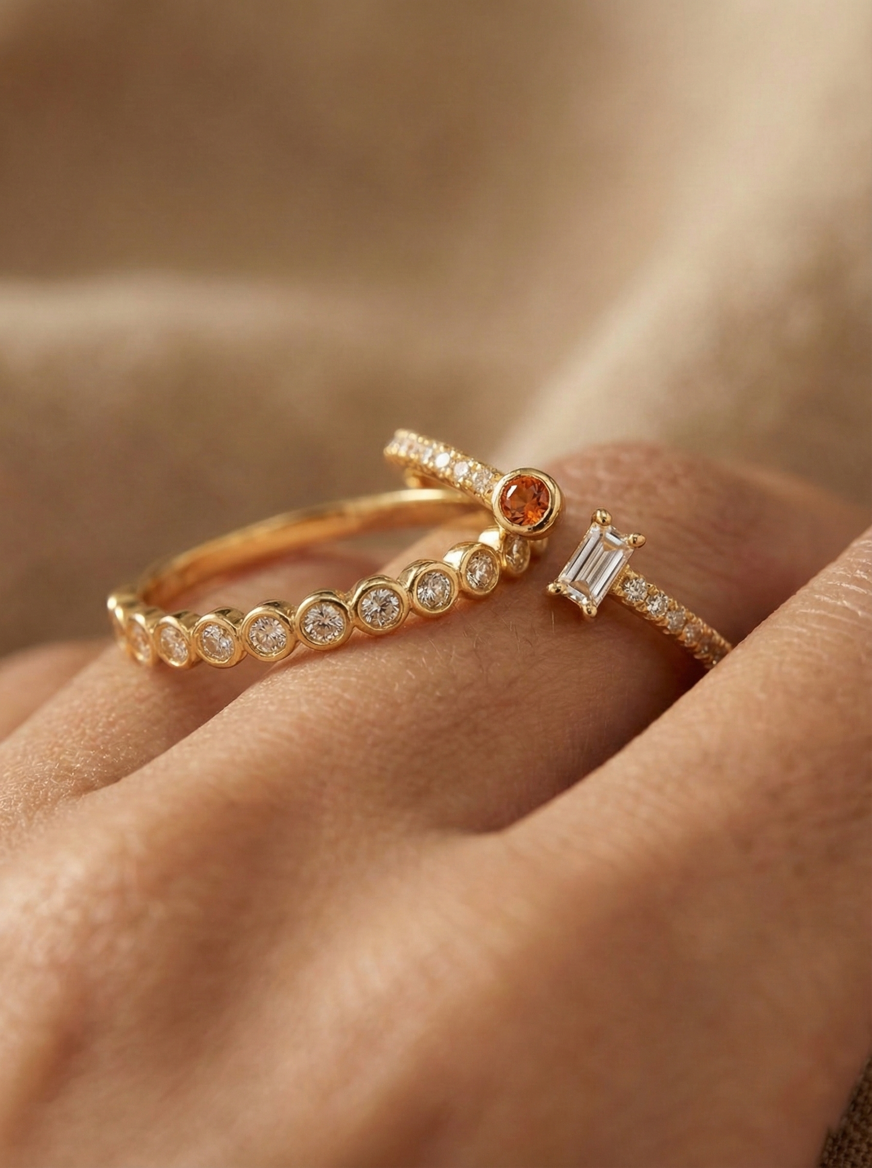 Together, the Sunset & Shine Duo creates a harmonious mix of soft glow and clean sparkle—ideal for everyday styling or elevating a layered ring look with understated sophistication.